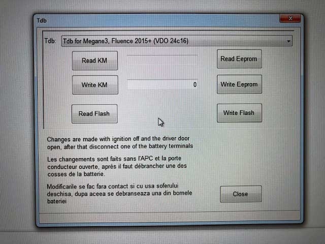 - Read/write km,- read/write eeprom, - read/write flash for dasboard Renault Fluence.