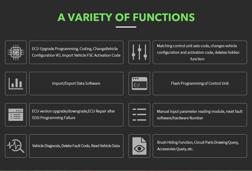 Porsche 2, Porsche 3 (Doip), BMW (Doip), Mercedes-Benz (Doip), Honda, Toyota, Ford, Mazda, GM (Chevrolet, Buick, GMC, Cadillac, Holden, Opel, Vauxhall Pontiac, Hummer, Saab , Saturn) VAG (VW, AUDI, Seat, Skoda, Bentley, Lamborghini) Land Rover, Jaguar, Subaru and Volvo model diagnostic & programming.